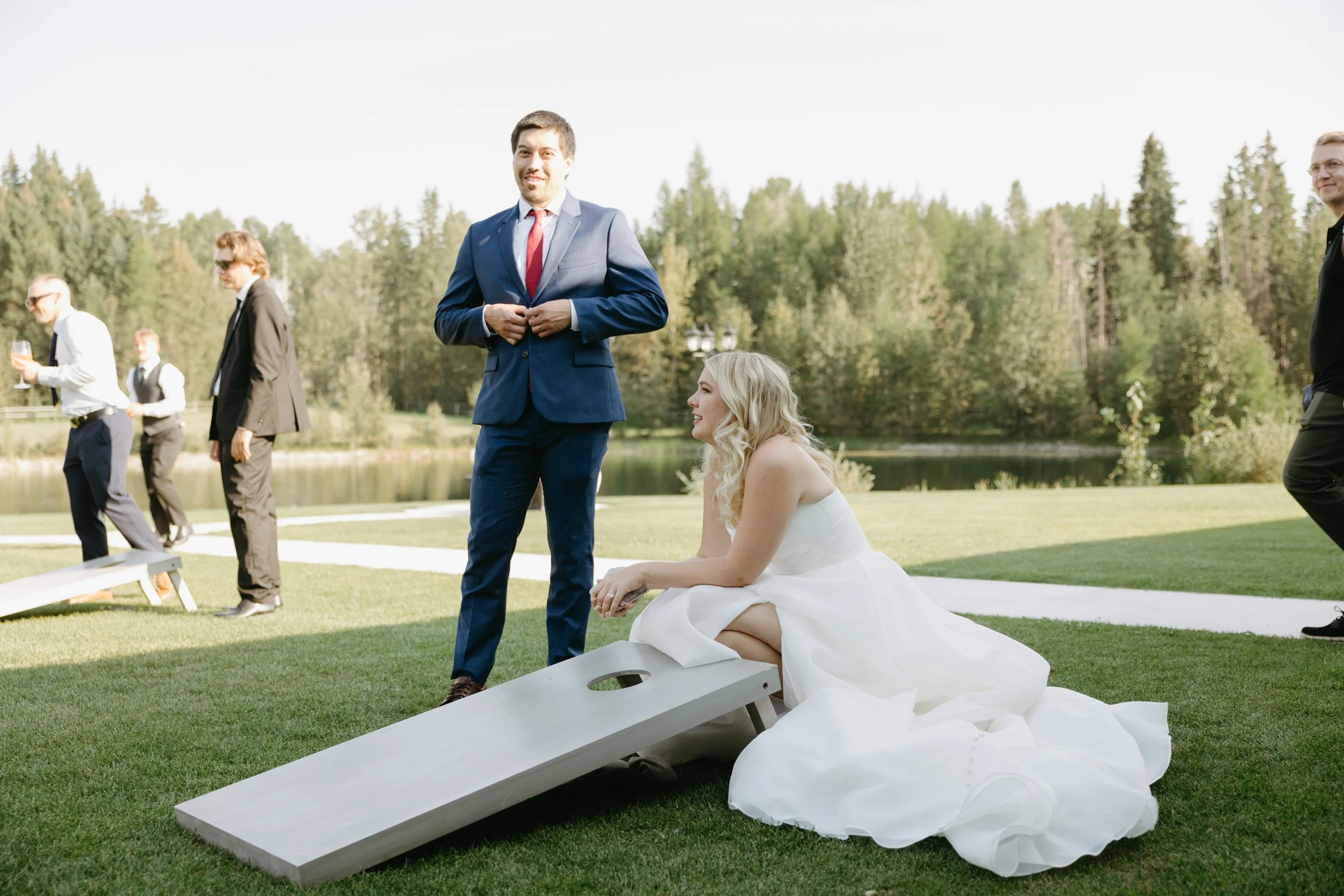 Cocktail hour can sometimes feel long for guests, so having lawn games available was a great way to keep the energy up. We made our own cornhole boards and painted them to match our wedding colours.